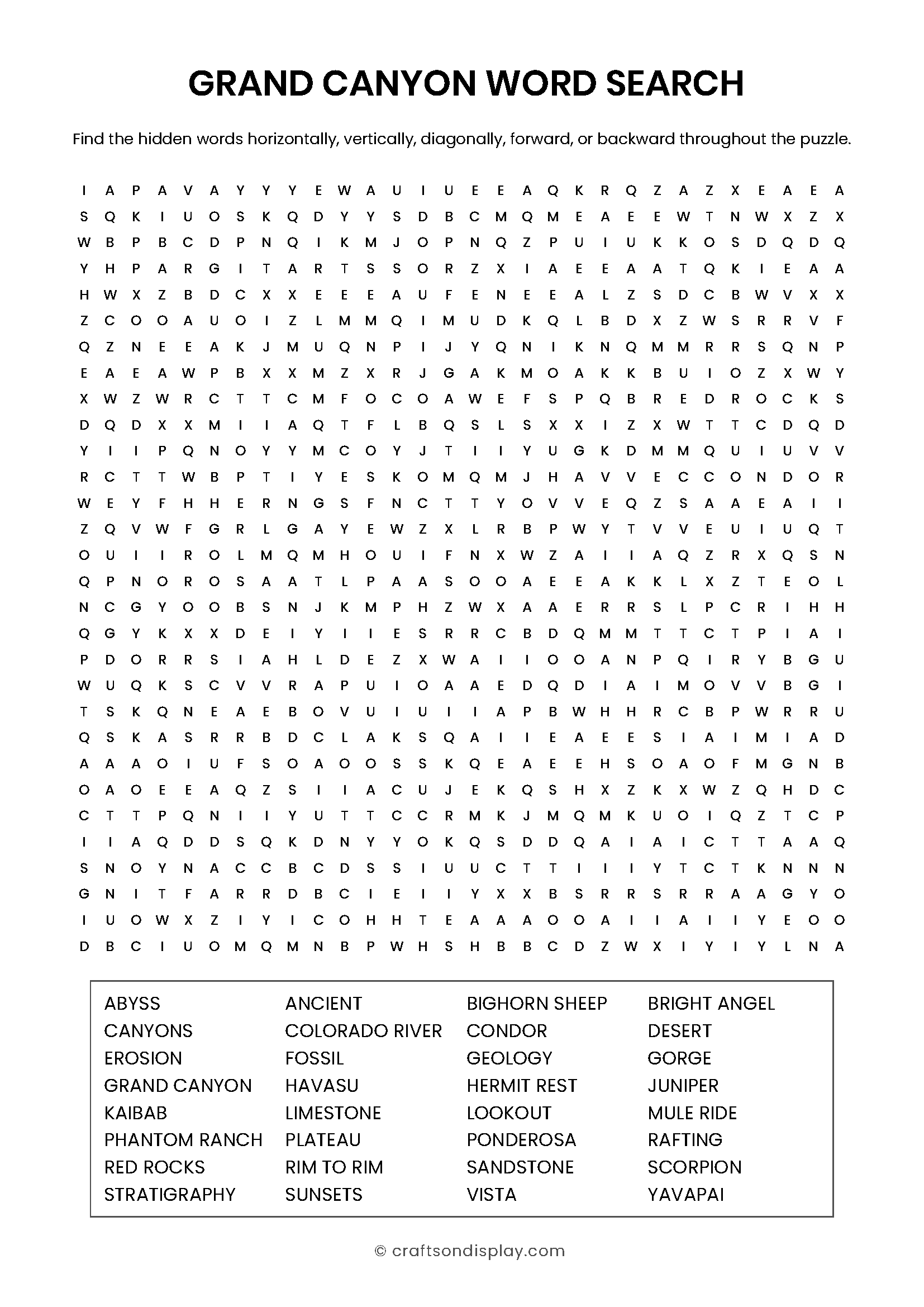 Dive into the deep history of the earth while searching for terms related to the Colorado River and the canyon’s massive red rock walls. [Download Puzzle and Answer Key PDF]