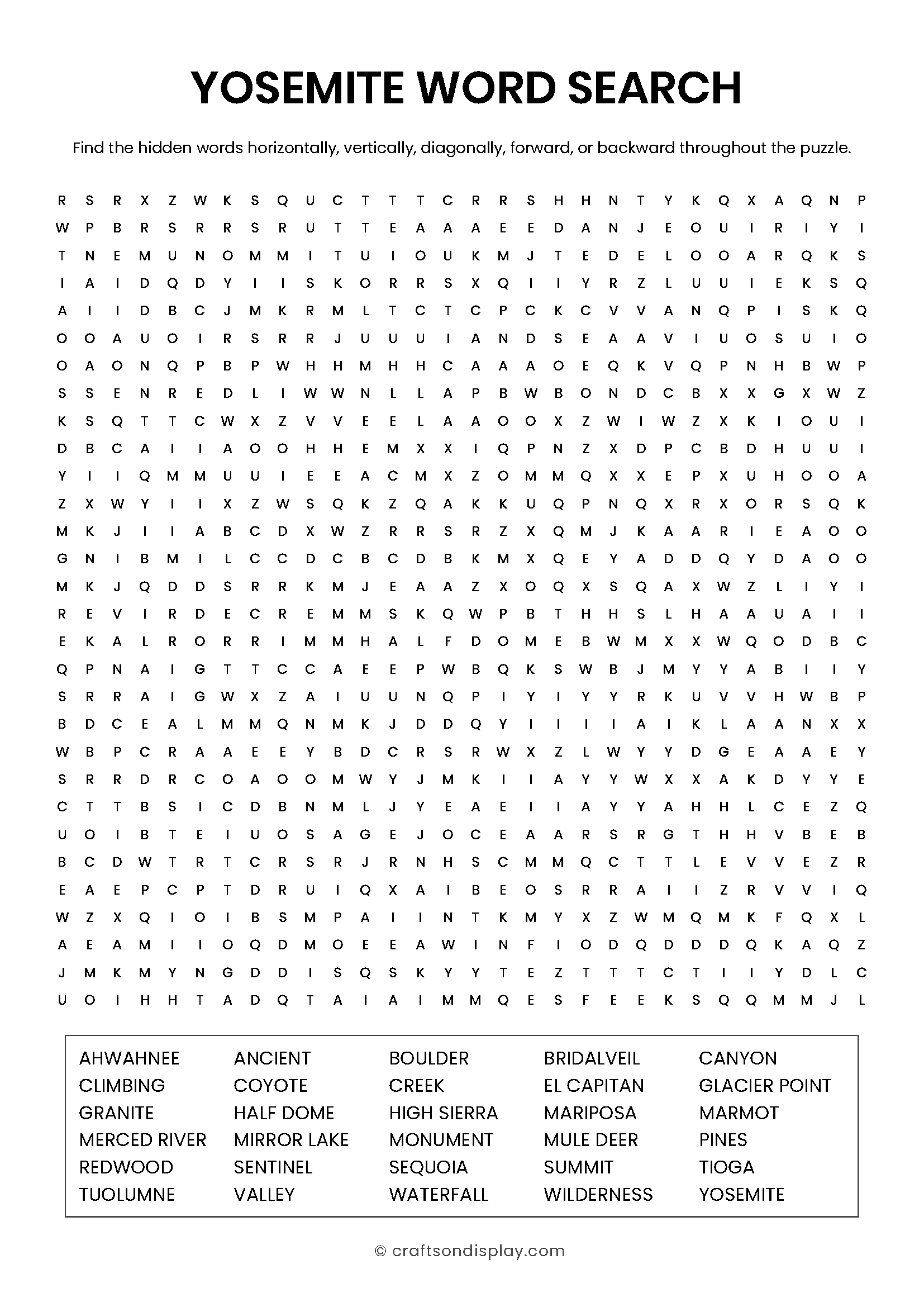 Search for the towering peaks of El Capitan and Half Dome along with the magnificent waterfalls of the Sierra Nevada. [Download Puzzle and Answer Key PDF]